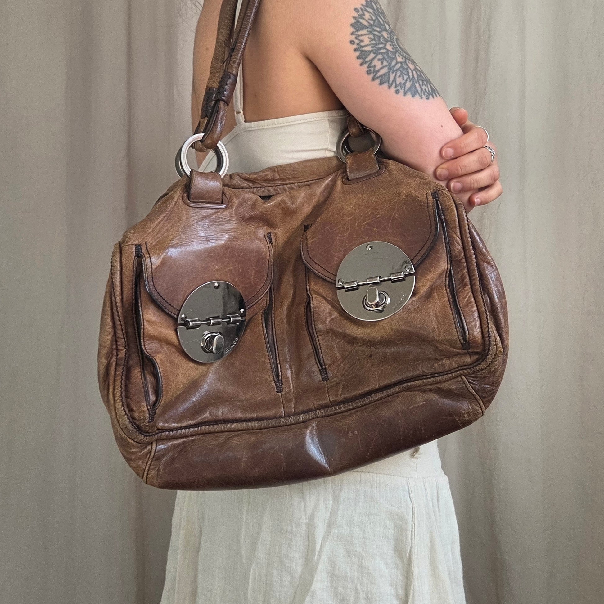 Vintage Oct 09 Leather Brown Bag with with two front pockets with silver hardware closer.