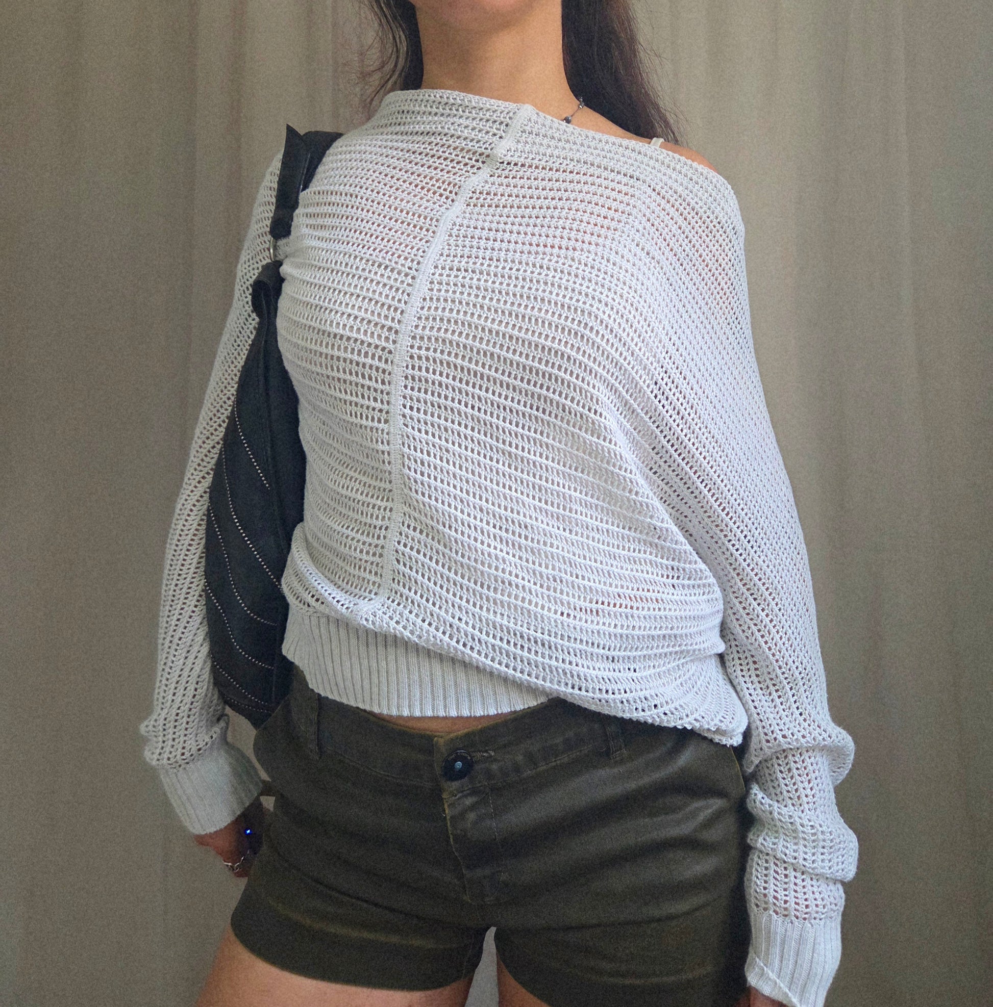 All Saints Knit Jumper with Batwing fitted sleeves and uneven shape cut. Cream