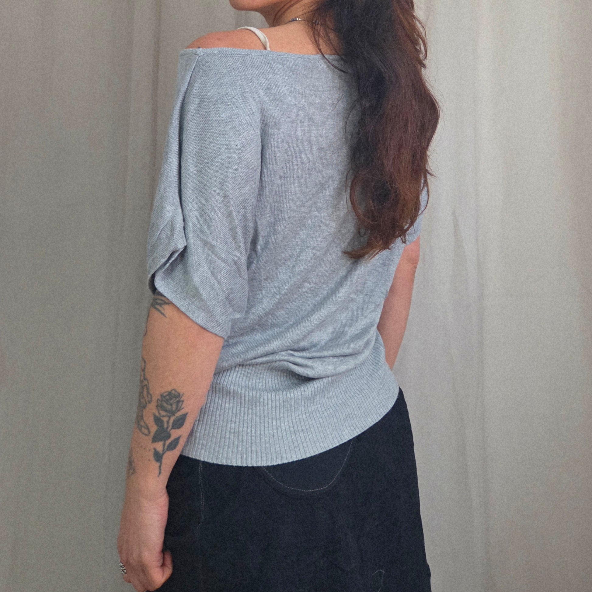 Vintage Grey Boat neck Jumper with short sleeves and ribbed fitted waist