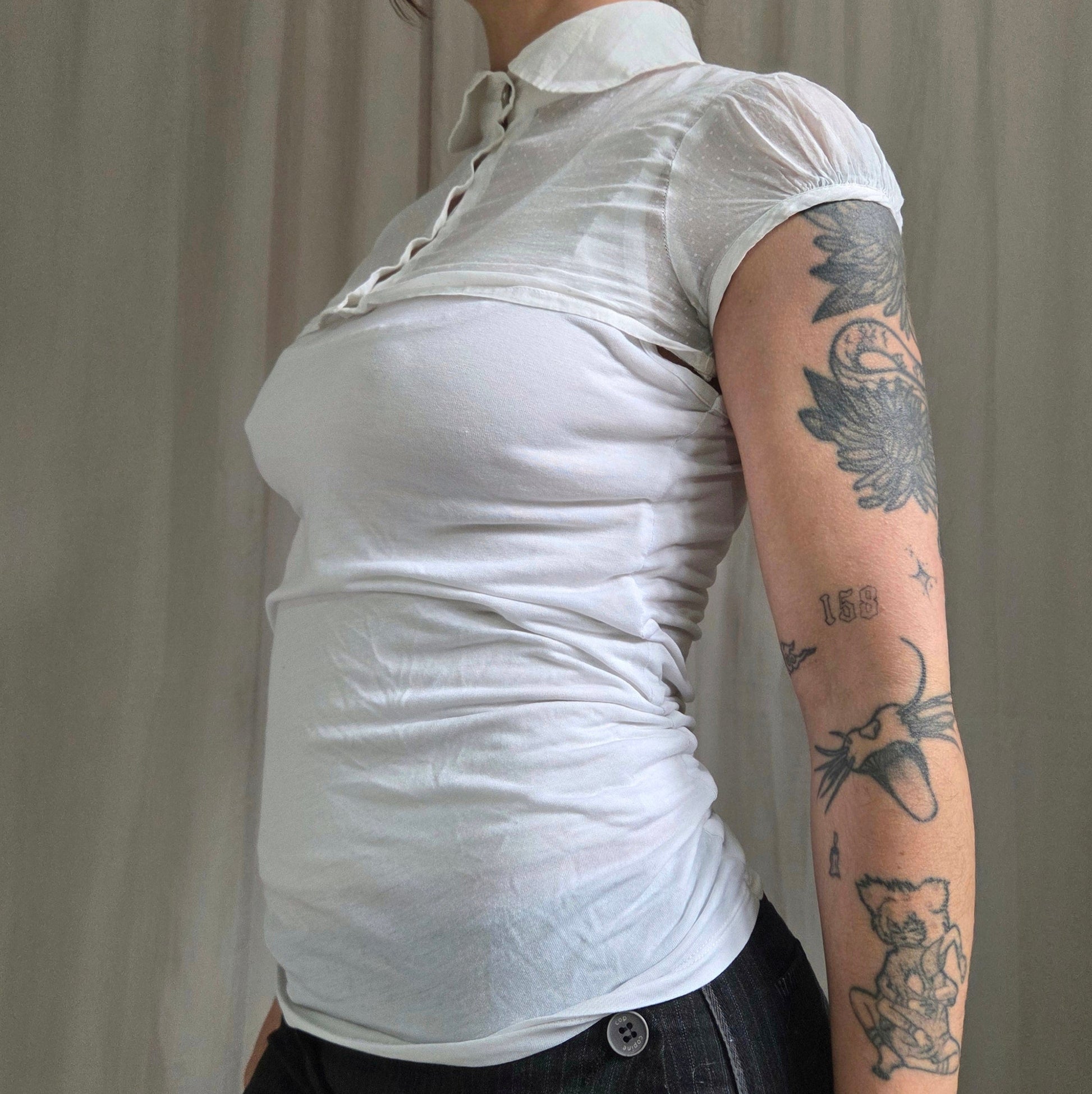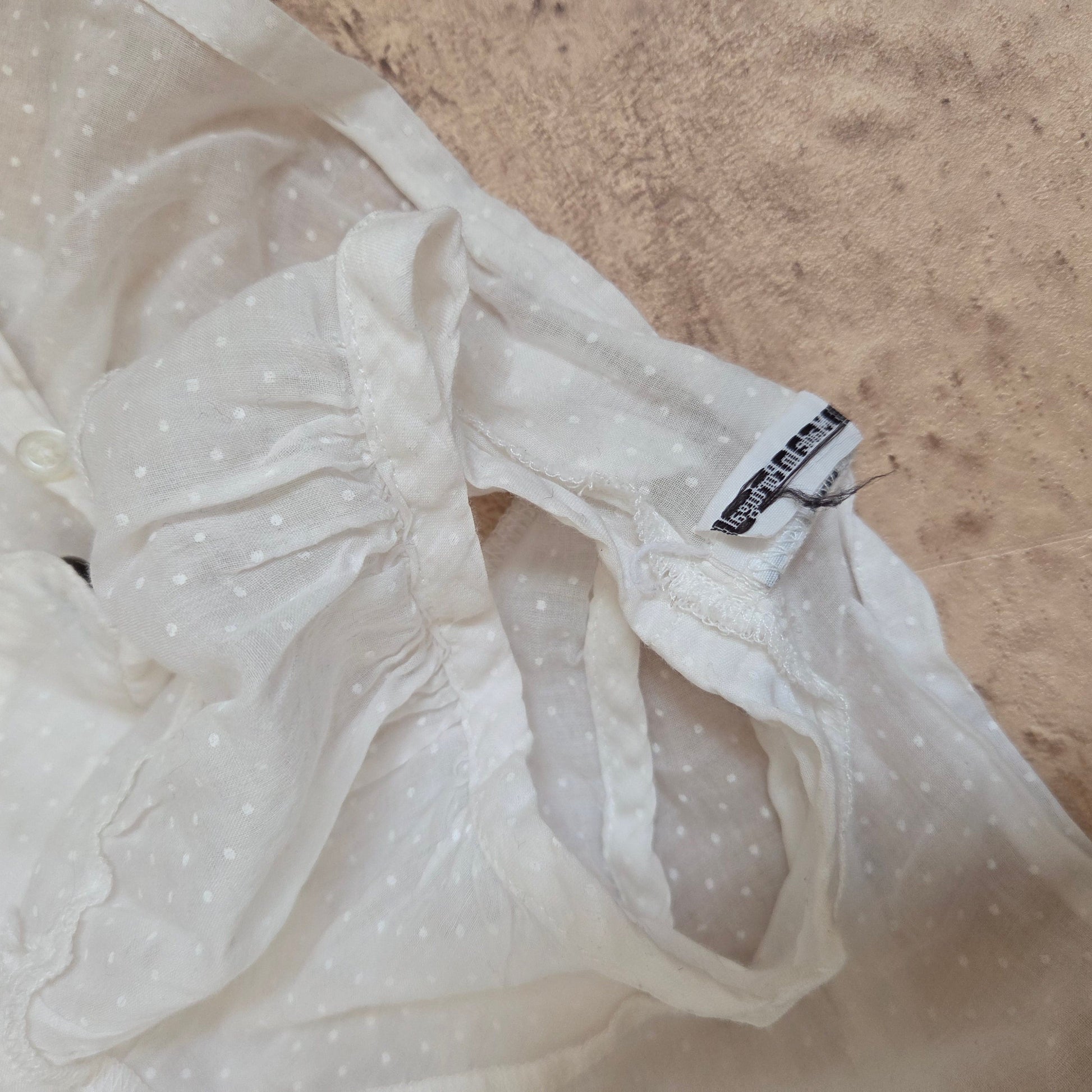 Cop Copine Dot Cropped Bolero. Button up polka dot short cardigan, sheer, short sleeves, white