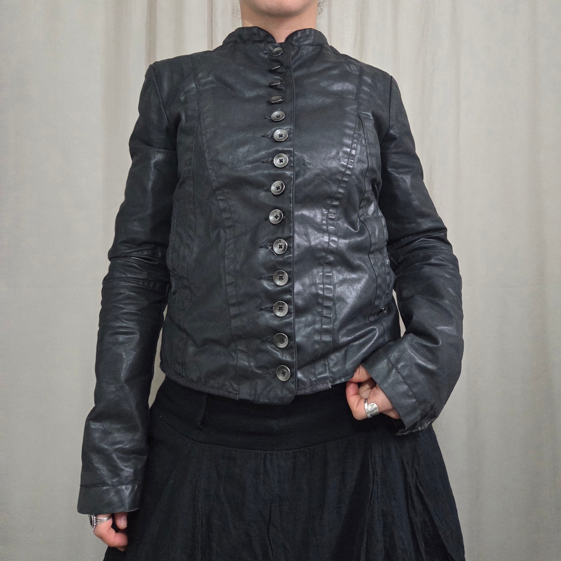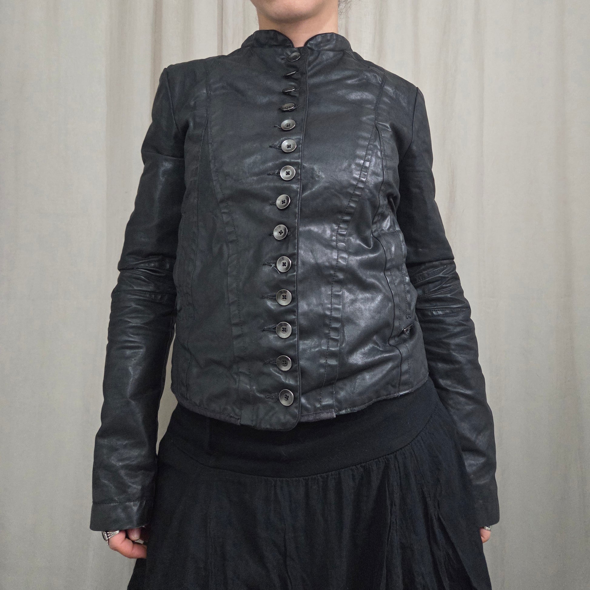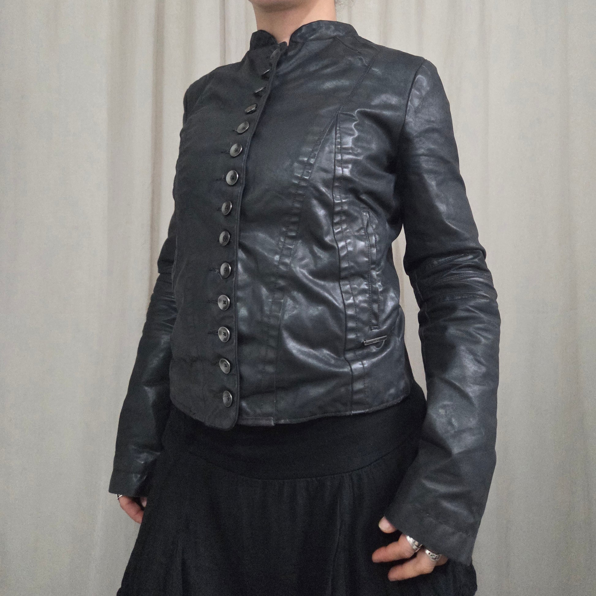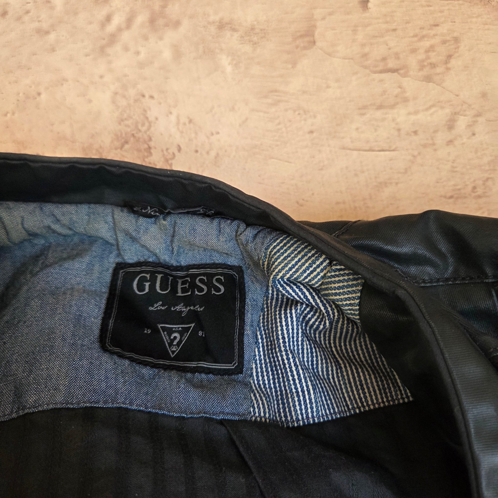Guess stand-up collar, coated fabric, row of round buttons running down the front center. Embroidered name on the sleeve