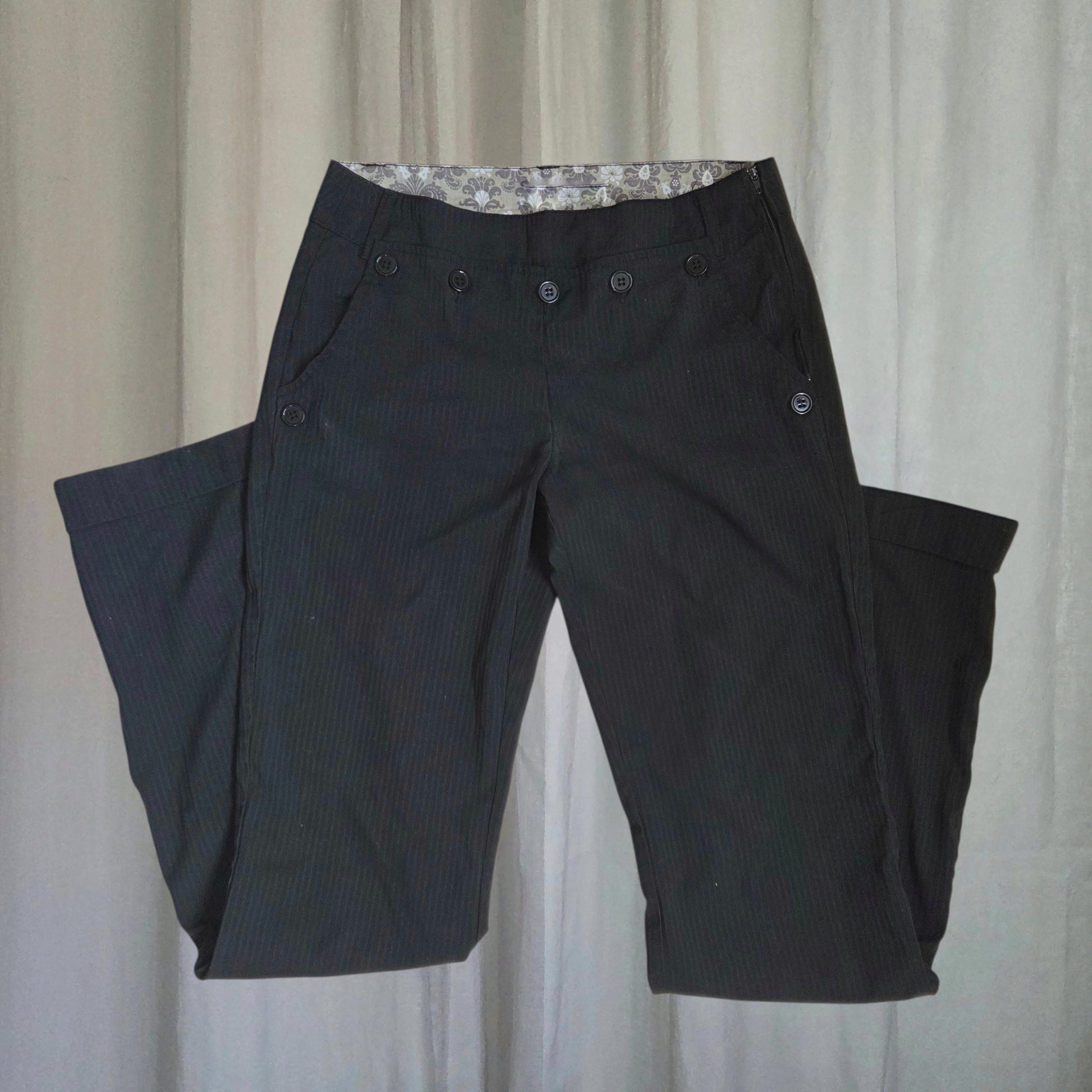 Vintage Button front pinstripe straight wide leg trousers with a zip closer. Black grey