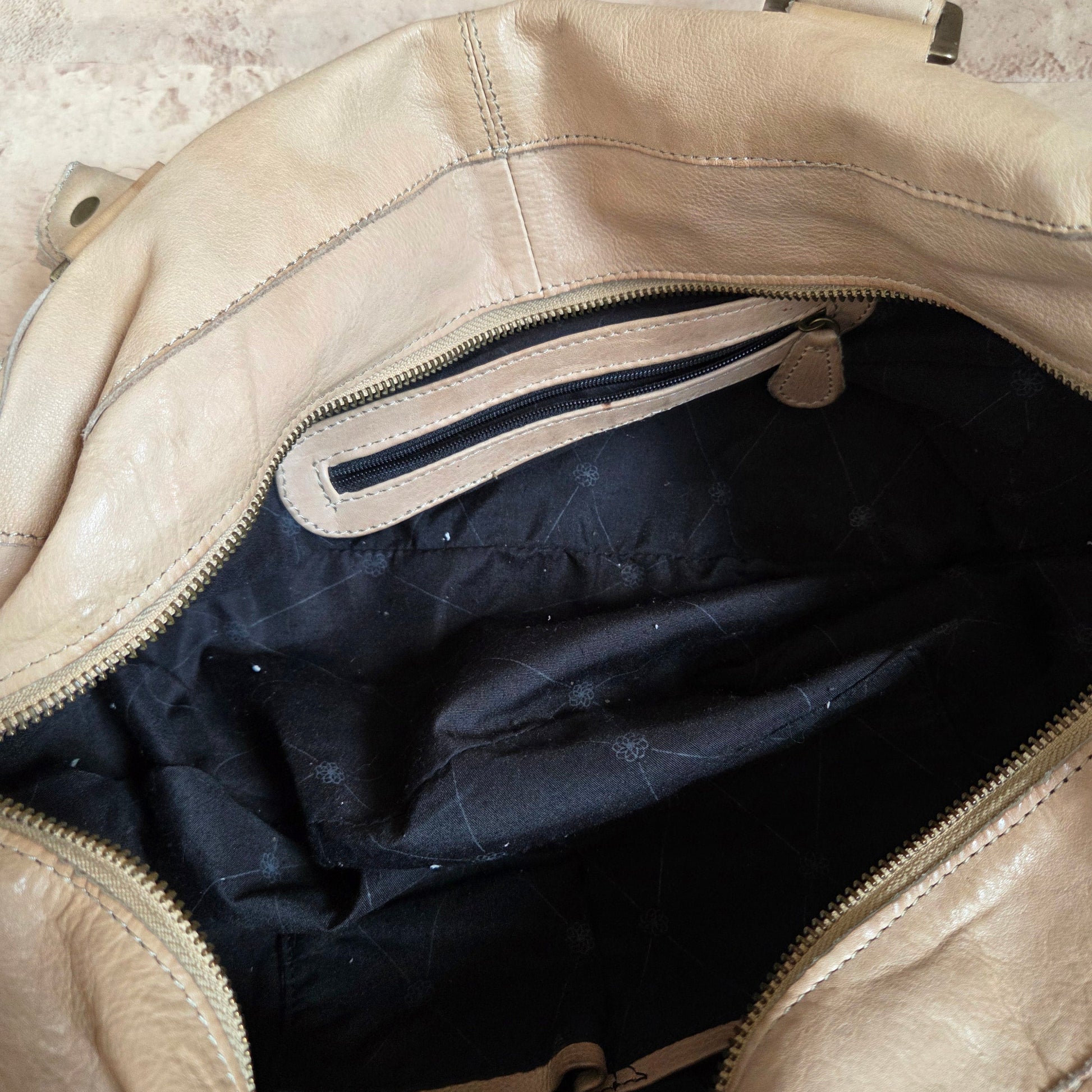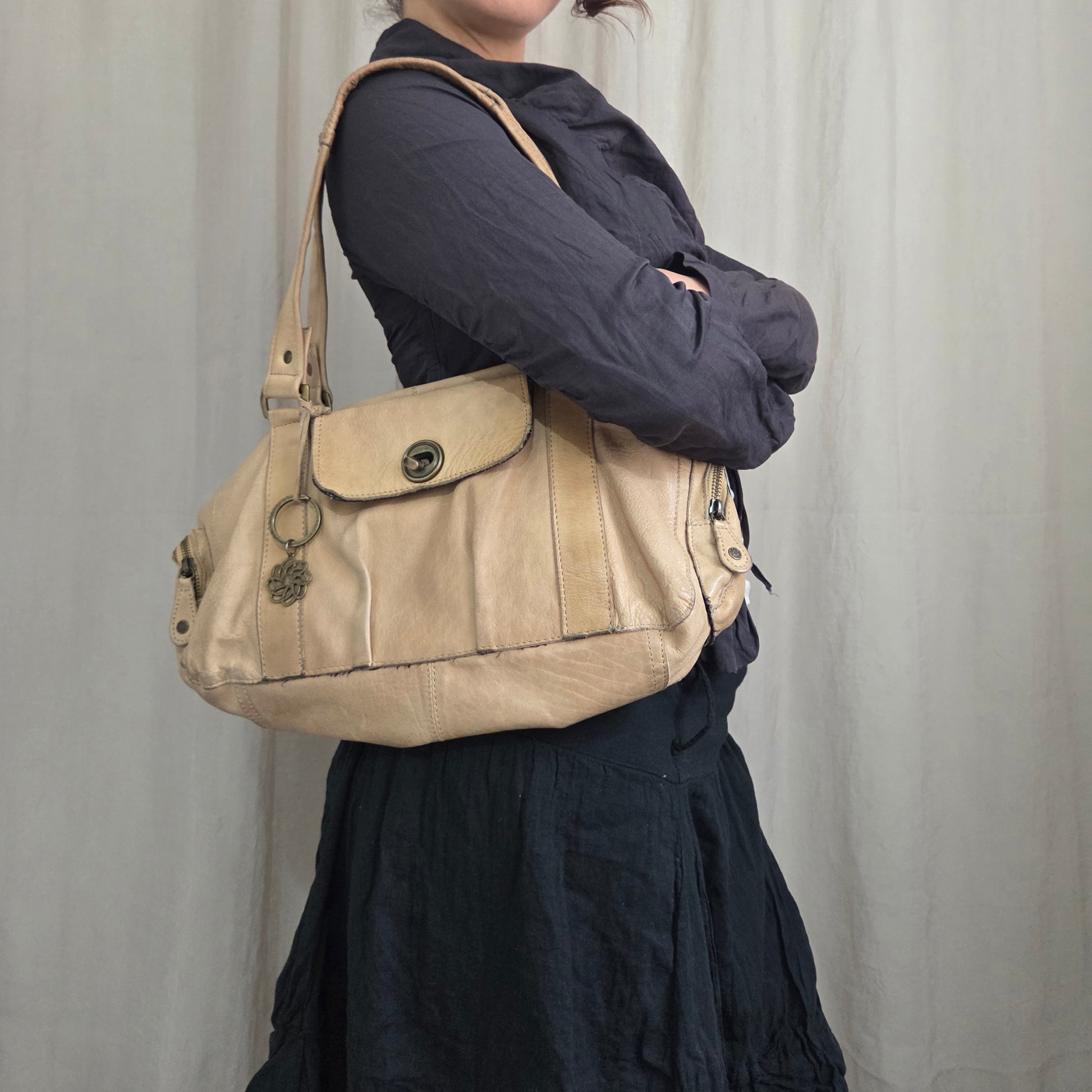 Vintage Cream Hardware Shoulder Bag. Front clip button, side pockets, charms